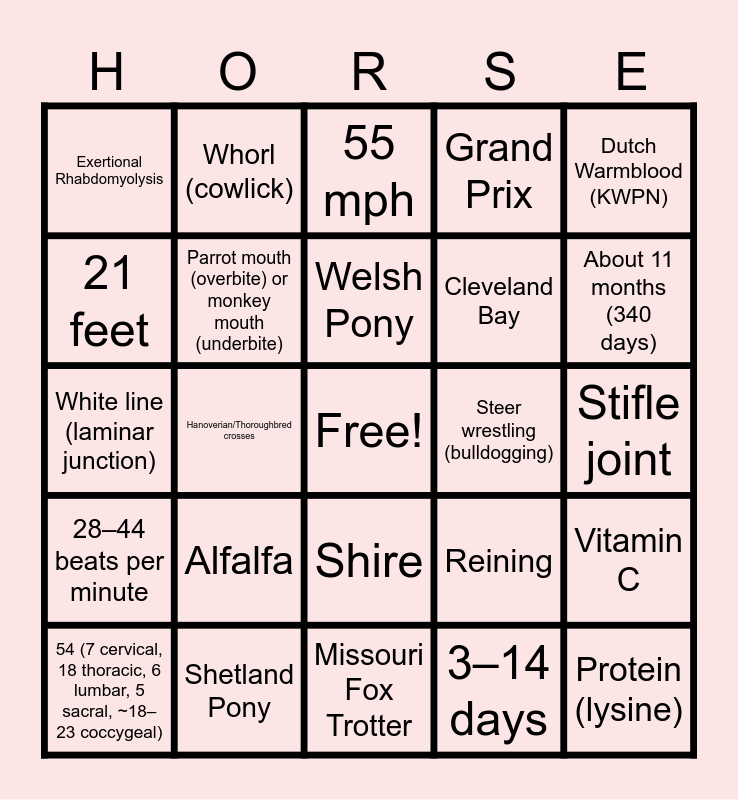 This bingo card has a free space and 30 words: Shetland Pony, 5–15 gallons per day, Hanoverian/Thoroughbred crosses, Strangles, Exertional Rhabdomyolysis, 55 mph, Parrot mouth (overbite) or monkey mouth (underbite), Shire, Steer wrestling (bulldogging), Missouri Fox Trotter, Stifle joint, Protein (lysine), 3–14 days, Calcium (due to excess phosphorus), About 11 months (340 days), Hock joint, Reining, 28–44 beats per minute, Alfalfa, Dutch Warmblood (KWPN), White line (laminar junction), Blind staggers (alkali disease), Whorl (cowlick), Cleveland Bay, 21 feet, Grand Prix, Vitamin C, 54 (7 cervical, 18 thoracic, 6 lumbar, 5 sacral, ~18–23 coccygeal), Welsh Pony and Suspensory desmitis.