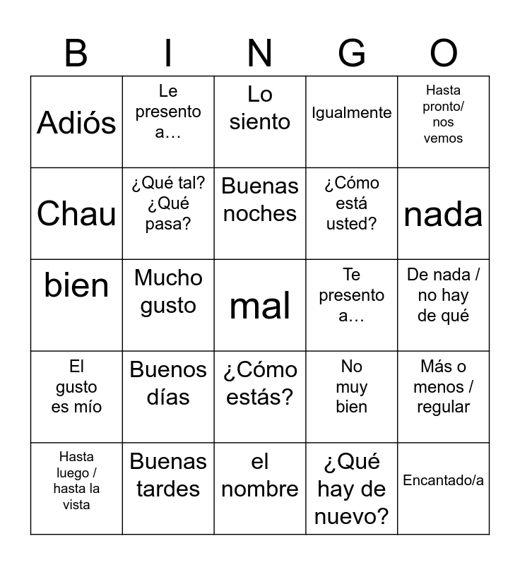 This bingo card has a free space and 24 words: Buenos días, Buenas tardes, Buenas noches, Hasta luego / hasta la vista, Hasta pronto/ nos vemos, Adiós, Chau, Le presento a…, Te presento a…, ¿Cómo estás?, ¿Cómo está usted?, bien, No muy bien, Más o menos / regular, ¿Qué tal? ¿Qué pasa?, ¿Qué hay de nuevo?, De nada / no hay de qué, Lo siento, nada, Mucho gusto, Encantado/a, El gusto es mío, Igualmente and el nombre.