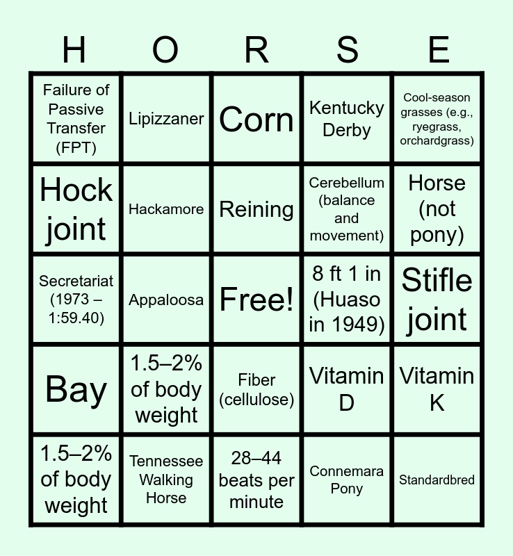 This bingo card has a free space and 30 words: Tennessee Walking Horse, Equine Rhinopneumonitis (respiratory and neurologic forms), Appaloosa, Withers, Failure of Passive Transfer (FPT), Corn, Hackamore, Fiber (cellulose), 8 ft 1 in (Huaso in 1949), 28–44 beats per minute, Stifle joint, Standardbred, Connemara Pony, Strongyles (small and large), Horse (not pony), 55 mph, Vitamin D, Bay, 1.5–2% of body weight, Cool-season grasses (e.g., ryegrass, orchardgrass), Secretariat (1973 – 1:59.40), Frog, Lipizzaner, Cerebellum (balance and movement), Hock joint, Kentucky Derby, Vitamin K, 1.5–2% of body weight, Reining and Whorl (cowlick).