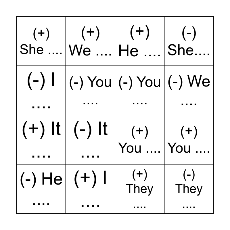 This bingo card has 16 words: (+) I ...., (+) You ...., (+) He ...., (+) She ...., (+) It ...., (+) We ...., (+) You ...., (+) They ...., (-) I ...., (-) You ...., (-) He ...., (-) She...., (-) It ...., (-) We ...., (-) You .... and (-) They .....