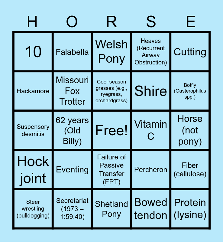 This bingo card has a free space and 31 words: Shetland Pony, Cushing’s disease (PPID: Pituitary Pars Intermedia Dysfunction), 62 years (Old Billy), Girth (or cinch in Western), 10, Welsh Pony, Missouri Fox Trotter, Percheron, Vitamin C, Bowed tendon, Horse (not pony), Protein (lysine), Stifle joint, Tetanus, Botfly (Gasterophilus spp.), 8 ft 1 in (Huaso in 1949), Fiber (cellulose), Eventing, Hock joint, Failure of Passive Transfer (FPT), Cutting, Corn, Steer wrestling (bulldogging), Falabella, Shire, Hackamore, Heaves (Recurrent Airway Obstruction), Suspensory desmitis, Secretariat (1973 – 1:59.40), Cool-season grasses (e.g., ryegrass, orchardgrass) and Lipizzaner.