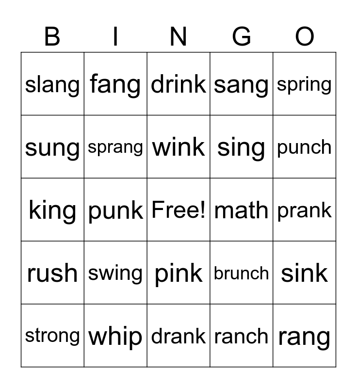 This bingo card has a free space and 34 words: bank, ranch, thank, sixth, rush, sprang, spring, strong, fang, sunk, wink, drink, link, crunch, math, punch, whip, king, swing, brunch, pink, trench, slang, prank, drank, rang, sang, song, sing, sung, tank, punk, sink and honk.