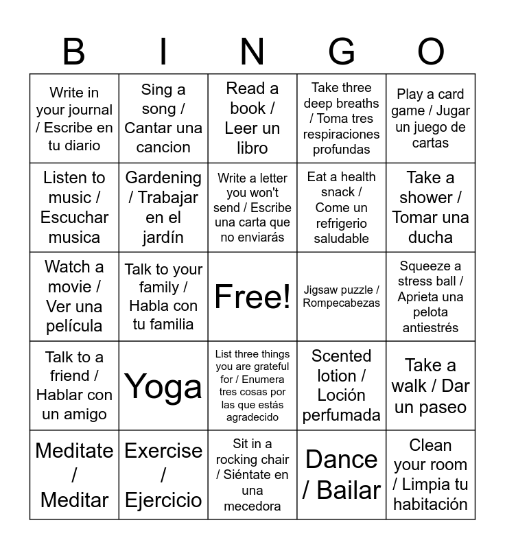 This bingo card has a free space and 28 words: Take a walk / Dar un paseo, Draw / Dibujar, Eat a health snack / Come un refrigerio saludable, Dance / Bailar, Listen to music / Escuchar musica, Read a book / Leer un libro, Sing a song / Cantar una cancion, Talk to a friend / Hablar con un amigo, Jigsaw puzzle / Rompecabezas, Meditate / Meditar, Watch a movie / Ver una película, Take three deep breaths / Toma tres respiraciones profundas, Exercise / Ejercicio, Sit in a rocking chair / Siéntate en una mecedora, Take a shower / Tomar una ducha, Watch a funny video / Mira un video divertido, Yoga, Gardening / Trabajar en el jardín, Write a letter you won't send / Escribe una carta que no enviarás, List three things you are grateful for / Enumera tres cosas por las que estás agradecido, Write in your journal / Escribe en tu diario, Take a nap / Sestear, Clean your room / Limpia tu habitación, Talk to your family / Habla con tu familia, Squeeze a stress ball / Aprieta una pelota antiestrés, Scented lotion / Loción perfumada, Play a card game / Jugar un juego de cartas and Cook a healthy meal / Cocine una comida saludable.