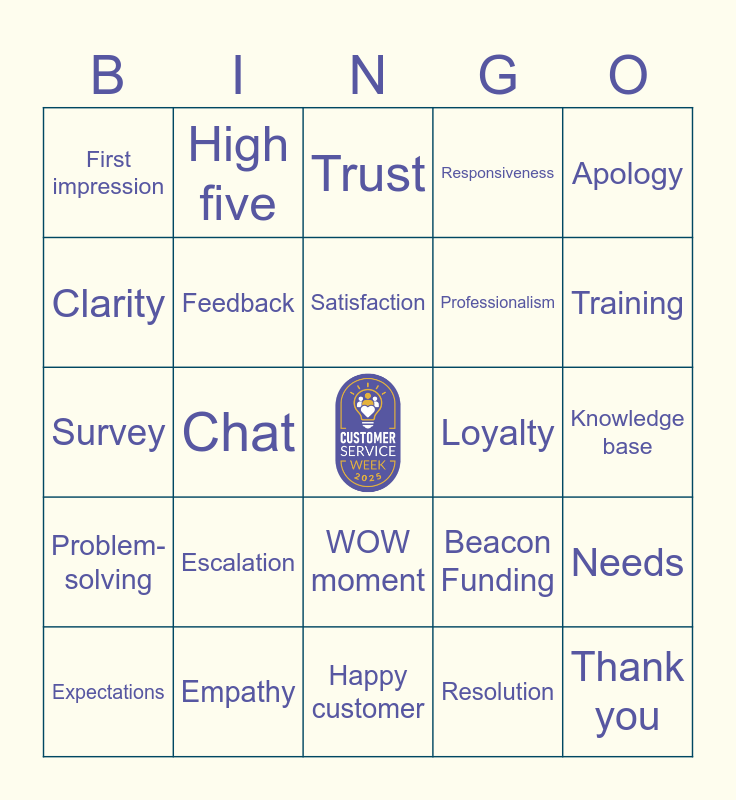 This bingo card has a free space and 61 words: Listening, Empathy, Patience, Problem-solving, Resolution, Follow-up, Feedback, Courtesy, Professionalism, Accountability, Responsiveness, Understanding, Clarity, Tone, Attitude, First impression, Thank you, Apology, Greeting, Satisfaction, Loyalty, Trust, Expectations, Needs, Experience, Collaboration, Support, Recognition, Training, Coaching, Teamwork, Positivity, Celebration, Appreciation, High five, Email, Phone call, Chat, CRM, Survey, Help desk, Escalation, Knowledge base, Response time, Beacon Funding, Customer Service Week, Coffee break, Above and beyond, Golden rule, WOW moment, Happy customer, Mission, Values, Service with heart, Adaptability, Ownership, Connection, Resolution mindset, Customer-first, Resolution path and Customer journey.