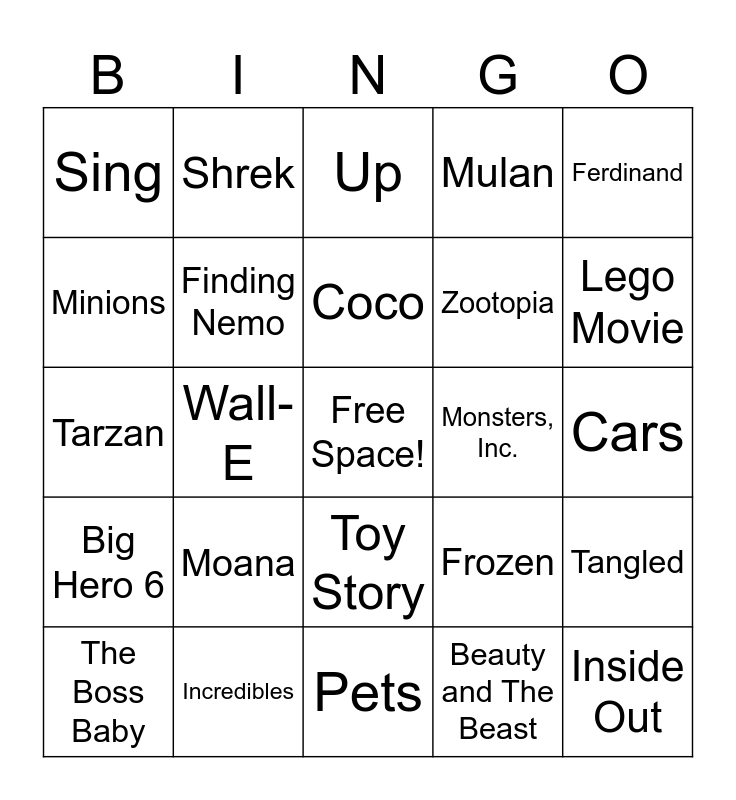 This bingo card has a free space and 24 words: Moana, Incredibles, Coco, The Boss Baby, Ferdinand, Sing, Minions, Shrek, Monsters, Inc., Toy Story, Zootopia, Tarzan, Frozen, Tangled, Finding Nemo, Beauty and The Beast, Cars, Up, Lego Movie, Wall- E, Inside Out, Big Hero 6, Mulan and Pets.
