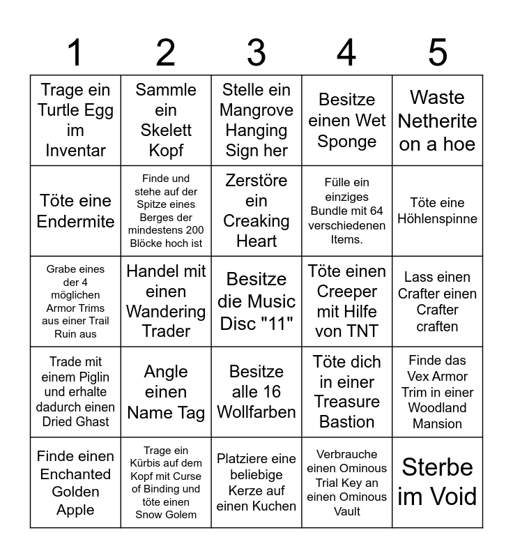 This bingo card has 25 words: Angle einen Name Tag, Platziere eine beliebige Kerze auf einen Kuchen, Zerstöre ein Creaking Heart, Finde einen Enchanted Golden Apple, Waste Netherite on a hoe, Trage ein Turtle Egg im Inventar, Töte eine Endermite, Sammle ein Skelett Kopf, Töte einen Creeper mit Hilfe von TNT, Besitze alle 16 Wollfarben, Fülle ein einziges Bundle mit 64 verschiedenen Items., Grabe eines der 4 möglichen Armor Trims aus einer Trail Ruin aus, Töte dich in einer Treasure Bastion, Finde das Vex Armor Trim in einer Woodland Mansion, Finde und stehe auf der Spitze eines Berges der mindestens 200 Blöcke hoch ist, Sterbe im Void, Lass einen Crafter einen Crafter craften, Stelle ein Mangrove Hanging Sign her, Töte eine Höhlenspinne, Handel mit einen Wandering Trader, Besitze die Music Disc "11", Trage ein Kürbis auf dem Kopf mit Curse of Binding und töte einen Snow Golem, Trade mit einem Piglin und erhalte dadurch einen Dried Ghast, Besitze einen Wet Sponge and Verbrauche einen Ominous Trial Key an einen Ominous Vault.