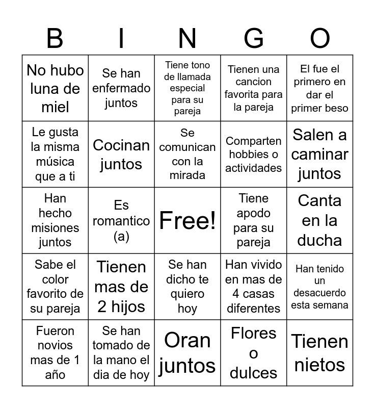 This bingo card has a free space and 29 words: Fueron novios mas de 1 año, Aniversario entre Julio y Diciembre, Es romantico (a), Casados mas de 15 años, No hubo luna de miel, Tiene tono de llamada especial para su pareja, Cocinan juntos, Tienen mas de 2 hijos, Tiene apodo para su pareja, Se han tomado de la mano el dia de hoy, Canta en la ducha, Tienen nietos, Oran juntos, Flores o dulces, Salen a caminar juntos, Les gusta ver peliculas juntos, Se han dicho te quiero hoy, Sabe el color favorito de su pareja, El fue el primero en dar el primer beso, Han hecho misiones juntos, Han vivido en mas de 4 casas diferentes, Sus familias se conocian antes de casarse, Comparten hobbies o actividades, Le gusta la misma música que a ti, Tienen una cancion favorita para la pareja, Se han enfermado juntos, Han tenido un desacuerdo esta semana, Se comunican con la mirada and Sabe el personaje bíblico favortito de su pareja.