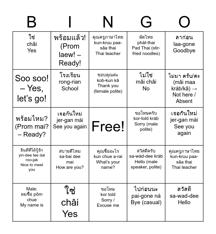 This bingo card has a free space and 48 words: สบายดี sa-bai dee I’m fine, สวัสดี sa-wad-dee Hello, ขอบคุณ kob kun Thank you, ขอโทษ kor told Sorry / Excuse me, สบายดีไหม sa-bai dee mai How are you?, พร้อมไหม? (Prom mai? – Ready?, พร้อมแล้ว! (Prom laew! – Ready!, Soo mai? – Fight/try?, Soo soo! – Yes, let’s go!, ห้องน้ำ hông-nám Bathroom / Restroom, โรงเรียน rong-rian School, ผัดไทย phàt-thai Pad Thai (stir-fried noodles), คุณครูภาษาไทย kun-kruu paa-sǎa thai Thai teacher, สวัสดีครับ sa-wàd-dee kráb Hello (male speaker, polite), สวัสดีค่ะ sa-wd-dee kâ Hello (female speaker, polite), ขอบคุณครับ kob-kun kráb Thank you (male polite), ขอบคุณค่ะ kob-kun kâ Thank you (female polite), ขอโทษครับ kor-told kráb Sorry (male polite), ขอโทษค่ะ kor-told kâ Sorry (female polite), ลาก่อน laa-gone Goodbye, เจอกันใหม่ jer-gan mài See you again, ไปก่อนนะ pai-gone ná Bye (casual), ใช่ châi Yes, ไม่ใช่ mâi châi No, มา ครับ/ค่ะ (maa kráb/kâ) – I’m here, ไม่มา ครับ/ค่ะ (mâi maa kráb/kâ) → Not here / Absent, Male: ผมชื่อ pǒm chue My name is, Female: ฉันชื่อ chǎn chue My name is, คุณชื่ออะไร kun chue a-rai What’s your name?, ยินดีที่ได้รู้จัก yin-dee tee dai roo-jak Nice to meet you, สบายดี sa-bai dee I’m fine, สวัสดี sa-wad-dee Hello, ขอบคุณ kob kun Thank you, สบายดีไหม sa-bai dee mai How are you?, ใช่ châi Yes, ไม่ใช่ mâi châi No, ไปก่อนนะ pai-gone ná Bye (casual), เจอกันใหม่ jer-gan mài See you again, ห้องน้ำ hông-nám Bathroom / Restroom, สบายดีไหม sa-bai dee mai How are you?, สวัสดีค่ะ sa-wd-dee kâ Hello (female speaker, polite), สวัสดีครับ sa-wàd-dee kráb Hello (male speaker, polite), คุณครูภาษาไทย kun-kruu paa-sǎa thai Thai teacher, โรงเรียน rong-rian School, พร้อมไหม? (Prom mai? – Ready?, พร้อมแล้ว! (Prom laew! – Ready!, Soo mai? – Fight/try? and Soo soo! – Yes, let’s go!.