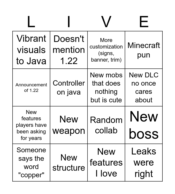 This bingo card has 24 words: End update, New game announcement, New DLC no once cares about, The Minecraft movie, Announcement of 1.22, Vibrant visuals to Java, Controller on java, Doesn't mention 1.22, New structure, Mob vote loser comes back, New features players have been asking for years, Random collab, Update aquatic v2, New features nobody asked for, New mobs that does nothing but is cute, New features I hate, New features I love, More customization (signs, banner, trim), New weapon, New boss, Someone says the word "copper", Leaks were right, Minecraft pun and Return of mob/biome vote.
