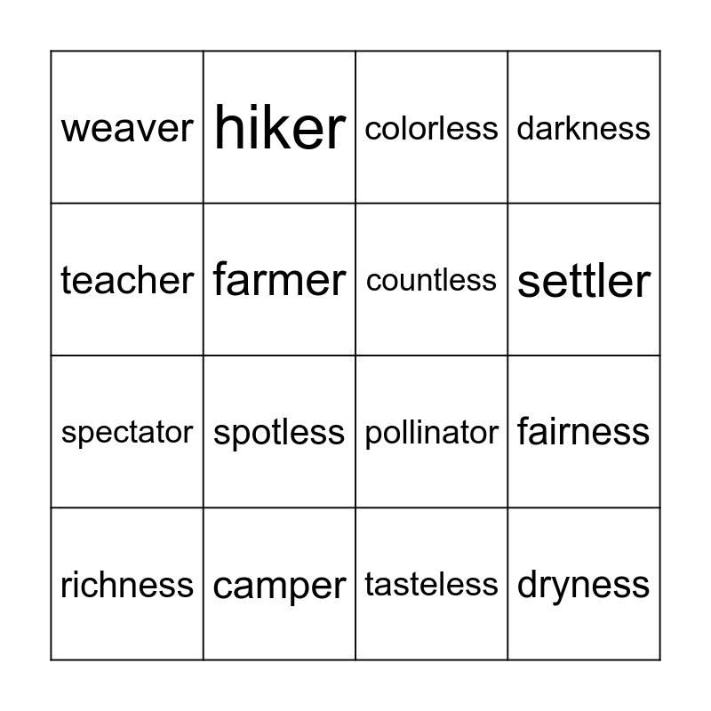 This bingo card has 24 words: explorer, baker, settler, dancer, teacher, weaver, farmer, hiker, camper, visitor, spectator, pollinator, sailor, director, countless, rainless, tasteless, colorless, spotless, fairness, richness, dryness, darkness and spiciness.