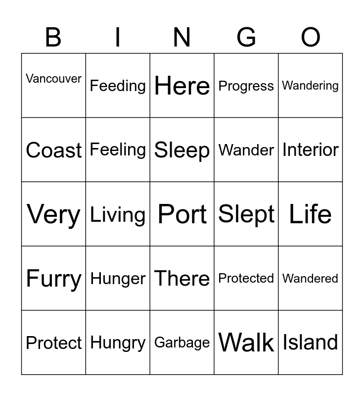 This bingo card has a free space and 24 words: Protect, Hunger, Sleep, Walk, Wandering, Vancouver, Feeding, Here, Slept, Life, Very, Feeling, Protected, Wandered, Coast, Hungry, Garbage, Progress, Interior, Furry, Living, There, Wander and Island.