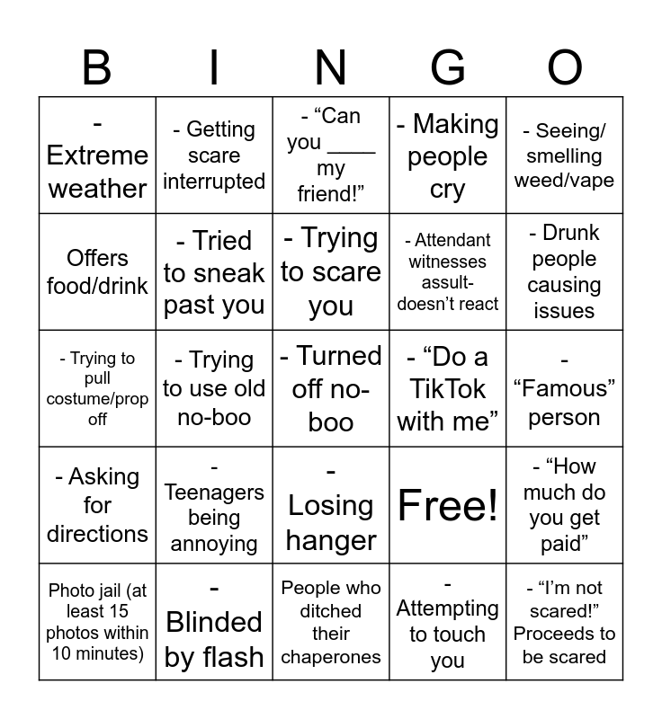 This bingo card has 25 words: - Teenagers being annoying, People who ditched their chaperones, - Trying to scare you, Photo jail (at least 15 photos within 10 minutes), - Seeing/ smelling weed/vape, - Extreme weather, Offers food/drink, - Getting scare interrupted, - “Do a TikTok with me”, - Losing hanger, - Attendant witnesses assult-doesn’t react, - Trying to pull costume/prop off, Free!, - “How much do you get paid”, - Tried to sneak past you, - “I’m not scared!” Proceeds to be scared, - “Famous” person, - “Can you ____ my friend!”, - Drunk people causing issues, - Trying to use old no-boo, - Turned off no-boo, - Blinded by flash, - Asking for directions, - Making people cry and - Attempting to touch you.