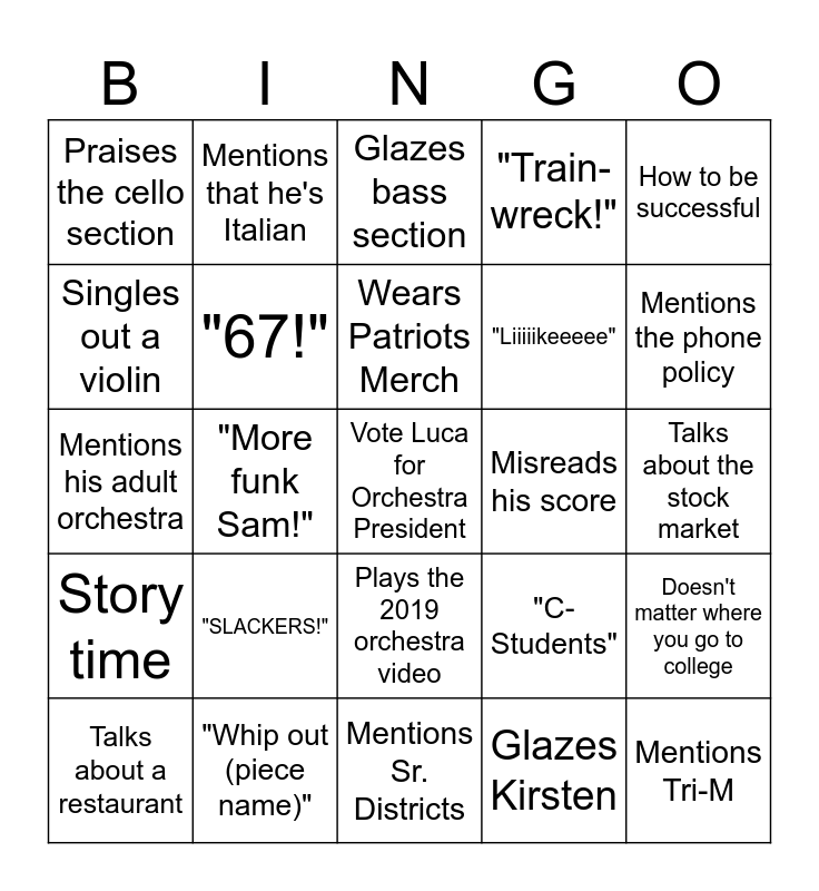 This bingo card has a free space and 24 words: "SLACKERS!", "Whip out (piece name)", Wears Patriots Merch, Talks about a restaurant, How to be successful, Praises the cello section, Singles out a violin, Mentions that he's Italian, Misreads his score, Plays the 2019 orchestra video, "Liiiiikeeeee", Mentions his adult orchestra, "C-Students", Doesn't matter where you go to college, "67!", Glazes Kirsten, Talks about the stock market, Glazes bass section, Mentions the phone policy, "More funk Sam!", Mentions Tri-M, Story time, "Train-wreck!" and Mentions Sr. Districts.