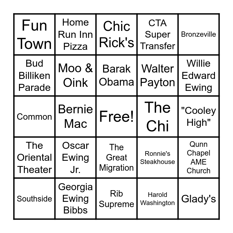 This bingo card has a free space and 55 words: "Streelight" Curfew, Southside, Westside, Fun Town, Rib Supreme, Lem's BBQ, Moo & Oink, Garrett's Popcorn, Walter Payton, Soul Train, CTA Super Transfer, Herb Kent, Harold's Chicken, Garfield Park Conservatory, South Shore Country Club, Regal Theater, Bronzeville, Bernie Mac, Riverview, Glady's, The Chi, "Good Times", Ronnie's Steakhouse, Chic Rick's, The Copherbox, Barak Obama, Harold Washington, Parkerhouse Sausage, "Cooley High", Qunn Chapel AME Church, "K" Town, "L" Town, Wild Irish Rose, Dan Ryan, Bud Billiken Parade, Common, Evergreen Plaza, The Oriental Theater, The Rink, Sherman "Dilla" Thomas, Home Run Inn Pizza, Oscar Ewing Sr. (born 1893), Hannah White Ewing (born 1900), Jimmie Dale Ewing, Oscar Ewing Jr., Georgia Ewing Bibbs, Mattie Ewing Bibbs, Sallie Mae Ewing Bennett, Arthur Ewing Sr., Willie Edward Ewing, James Ewing, Mollie White (born 1872), Amos Ewing Sr (born 1862), The Great Migration and East Chicago Heights.