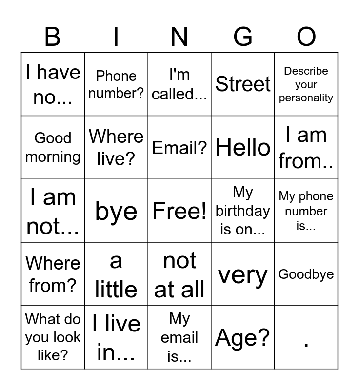 This bingo card has a free space and 34 words: Name ?, Age?, Name Spelling?, Birthday?, Where from?, Where live?, Describe your personality, What do you look like?, Phone number?, Address?, Email?, I'm called..., I am..., Years old, My birthday is on..., I am from.., I live in..., I am not..., a little, very, not at all, I have..., I have no..., My phone number is..., My email is..., ., Street, My address is..., Hello, Good morning, Good evening, bye, Goodbye and Good day.