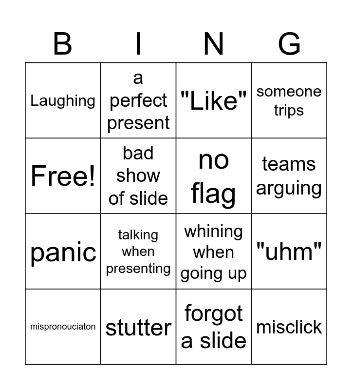 This bingo card has 16 words: stutter, "uhm", "Like", Laughing, panic, a perfect present, whining when going up, forgot a slide, Free!, bad show of slide, mispronouciaton, someone trips, talking when presenting, teams arguing, no flag and misclick.
