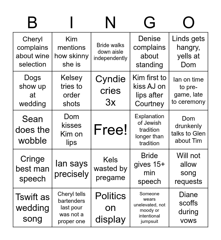 This bingo card has a free space and 25 words: Ian says precisely, Politics on display, Cyndie cries 3x, Tswift as wedding song, Linds gets hangry, yells at Dom, Cheryl complains about wine selection, Dogs show up at wedding, Kim mentions how skinny she is, Explanation of Jewish tradition longer than tradition, Kels wasted by pregame, Kim first to kiss AJ on lips after Courtney, Sean does the wobble, Bride gives 15+ min speech, Will not allow song requests, Kelsey tries to order shots, Politics mentioned by bride/groom in speech, Dom drunkenly talks to Glen about Tim, Bride walks down aisle independently, Ian on time to pre-game, late to ceremony, Dom kisses Kim on lips, Diane scoffs during vows, Cheryl tells bartenders last pour was not a proper one, Cringe best man speech, Denise complains about standing and Someone wears unelevated, not moody or intentional jumpsuit.