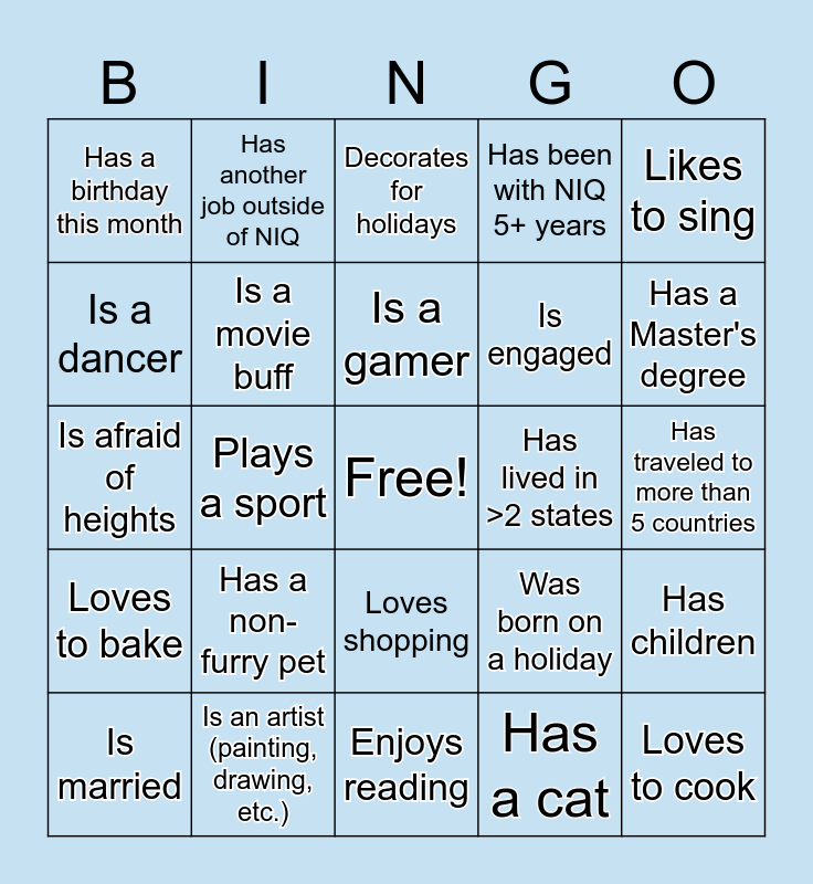 This bingo card has a free space and 29 words: Has a dog, Is an artist (painting, drawing, etc.), Decorates for holidays, Plays an instrument, Likes to sing, Has a birthday this month, Is a movie buff, Is a gamer, Has lived in >2 states, Has children, Is married, Plays a sport, Has a cat, Loves to cook, Is afraid of heights, Moved within the last year, Enjoys reading, Was born on a holiday, Has a Master's degree, Loves to bake, Has a non-furry pet, Has lived in >1 country, Is engaged, Has traveled to more than 5 countries, Is a dancer, Has another job outside of NIQ, Loves shopping, Has been with NIQ 5+ years and Is deeply rooted in family traditions.