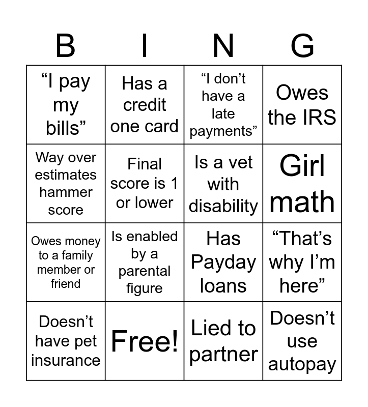 This bingo card has 16 words: Free!, “That’s why I’m here”, “I don’t have a late payments”, “I pay my bills”, Owes money to a family member or friend, Has a credit one card, Has Payday loans, Lied to partner, Way over estimates hammer score, Final score is 1 or lower, Doesn’t have pet insurance, Owes the IRS, Is enabled by a parental figure, Girl math, Is a vet with disability and Doesn’t use autopay.
