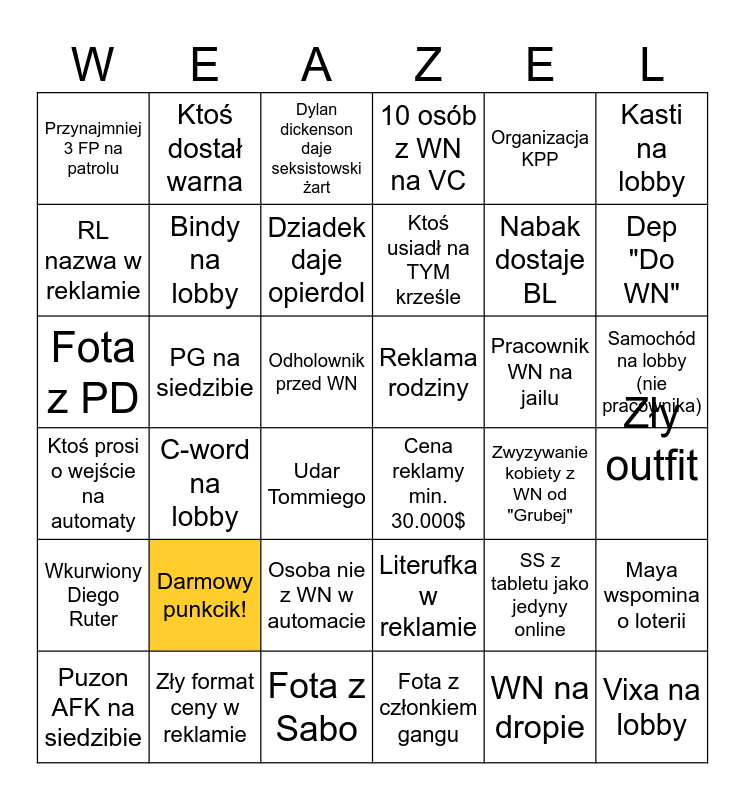 This bingo card has 36 words: Literufka w reklamie, Osoba nie z WN w automacie, Fota z członkiem gangu, RL nazwa w reklamie, Ktoś prosi o wejście na automaty, Reklama rodziny, Bindy na lobby, Fota z Sabo, Organizacja KPP, SS z tabletu jako jedyny online, Dep "Do WN", 10 osób z WN na VC, Maya wspomina o loterii, PG na siedzibie, Ktoś usiadł na TYM krześle, Przynajmniej 3 FP na patrolu, Wkurwiony Diego Ruter, Pracownik WN na jailu, Fota z PD, Dylan dickenson daje seksistowski żart, Odholownik przed WN, C-word na lobby, Cena reklamy min. 30.000$, Udar Tommiego, Zwyzywanie kobiety z WN od "Grubej", Ktoś dostał warna, Nabak dostaje BL, Zły format ceny w reklamie, Dziadek daje opierdol, Kasti na lobby, Vixa na lobby, Puzon AFK na siedzibie, Zły outfit, Samochód na lobby (nie pracownika), Darmowy punkcik! and WN na dropie.