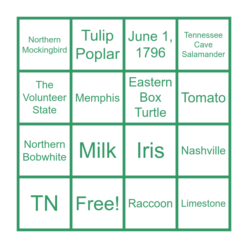 This bingo card has 16 words: Free!, Nashville, June 1, 1796, Northern Mockingbird, Northern Bobwhite, Tulip Poplar, Iris, Raccoon, The Volunteer State, Memphis, TN, Tennessee Cave Salamander, Milk, Tomato, Eastern Box Turtle and Limestone.