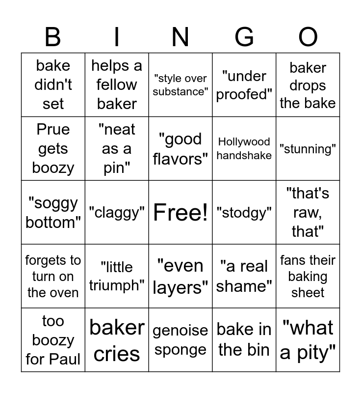 This bingo card has a free space and 24 words: "little triumph", baker cries, "good flavors", too boozy for Paul, baker drops the bake, bake didn't set, Prue gets boozy, helps a fellow baker, "stodgy", "even layers", Hollywood handshake, "soggy bottom", "a real shame", fans their baking sheet, "neat as a pin", bake in the bin, "that's raw, that", "style over substance", "stunning", "claggy", "what a pity", forgets to turn on the oven, "under proofed" and genoise sponge.