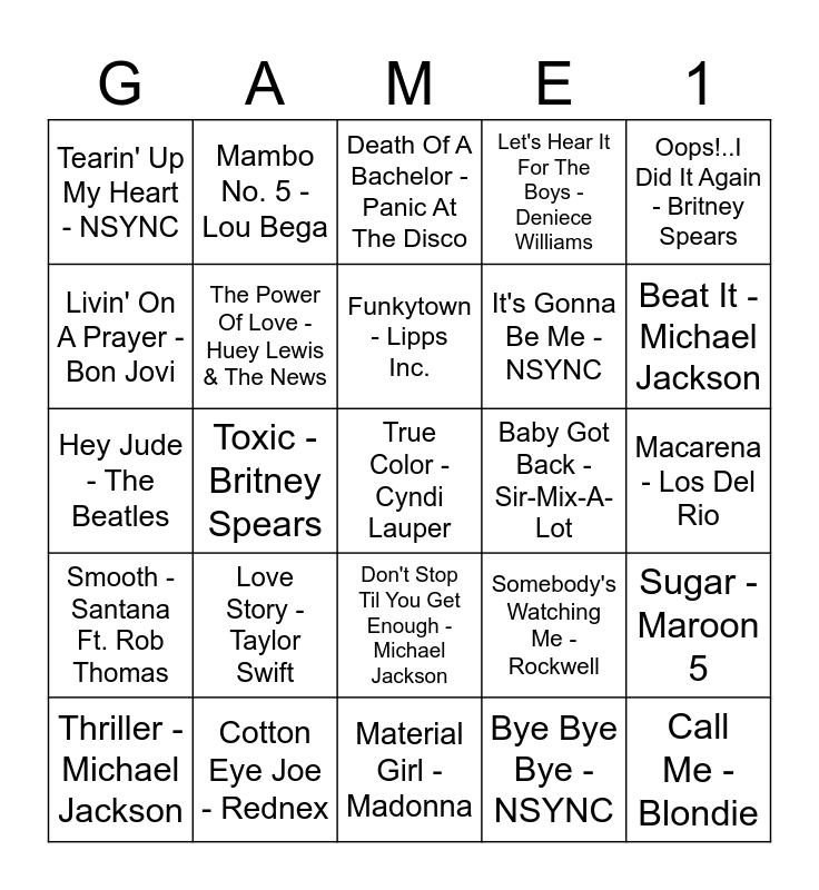 This bingo card has a free space and 49 words: Super Freak - Rick James, Call Me - Blondie, Billie Jean - Michael Jackson, Material Girl - Madonna, Love Story - Taylor Swift, All Night Long - Lionel Richie, Mambo No. 5 - Lou Bega, I Want To Hold You Hand - The Beatles, Livin' On A Prayer - Bon Jovi, Lovefool - The Cardigans, The Power Of Love - Huey Lewis & The News, Let's Hear It For The Boys - Deniece Williams, Sugar - Maroon 5, Somebody's Watching Me - Rockwell, Celebration - Kool & The Gang, Shake Your Groove Thing - Peaches & Herb, Funkytown - Lipps Inc., Baby Got Back - Sir-Mix-A-Lot, My Humps - Black Eyed Peas, Oops!..I Did It Again - Britney Spears, Toxic - Britney Spears, Bye Bye Bye - NSYNC, Tearin' Up My Heart - NSYNC, It's Gonna Be Me - NSYNC, Rock With You - Michael Jackson, Beat It - Michael Jackson, Thriller - Michael Jackson, Smooth Criminal - Michael Jackson, Don't Stop Til You Get Enough - Michael Jackson, Smooth - Santana Ft. Rob Thomas, Hero - Enrique Iglesias, Bailando - Enrique Iglesias, Rhythm Is A Dancer - SNAP!, What Is Love - Haddaway, Cotton Eye Joe - Rednex, Barbie Girl - Aqua, Blue (Da Be Dee) - Eiffel 65, Dragostea Din Tei - O-Zone, Macarena - Los Del Rio, Gasolina - Daddy Yankee, Hips Don't Lie - Shakira Ft. Wyclef Jean, Whenever, Wherever - Shakira, Angel - Shaggy, It Wasn't Me - Shaggy, Hey Jude - The Beatles, Death Of A Bachelor - Panic At The Disco, Mr. Brightside - The Killers, Kiss Kiss - Chris Brown Ft. T Pain and Doo Wop - Lauryn Hill.