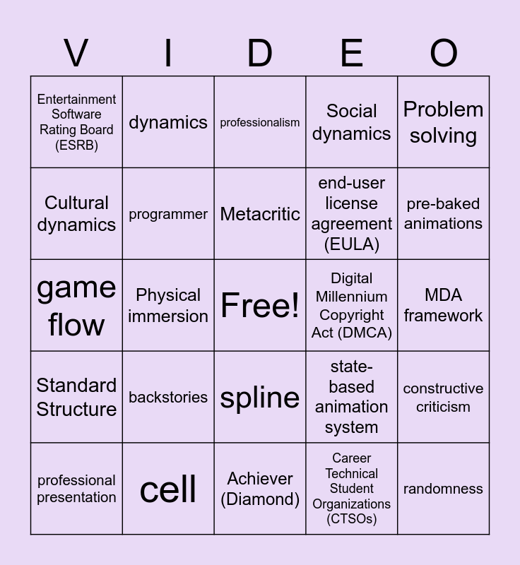 This bingo card has a free space and 62 words: PERT chart, cell, Gantt chart, Standard Structure, Core Structure, Virtual Structure, programmer, non-disclosure agreement (NDA), end-user license agreement (EULA), Intellectual property (IP), Social dynamics, Political dynamics, Cultural dynamics, Economcis dynamics, Technology dynamics, Entertainment Software Rating Board (ESRB), randomness, Problem solving, Kickstarter, Metacritic, Digital Millennium Copyright Act (DMCA), professionalism, professional presentation, Career Technical Student Organizations (CTSOs), extracurricular, Work-based learning, mentor, conflict resolution, constructive criticism, security policy, Cybersecurity, OSHA (Occupational Safety and Health Administration), demographics, computer vision syndrome (CVS), MDA framework, dynamics, immersive, Game state, Physical immersion, force feedback, game flow, mood board, backstories, self-aware, pre-baked animations, state-based animation system, clipping, animation state graph, or AnimStateGraph, Blended animation, Parameters, spline, Achiever (Diamond), Explorer (Spade), Motion paths, Game feel, Positive reinforcement, breadcrumbs, funneling, spatial representation, emphasis, Alignment and balance.