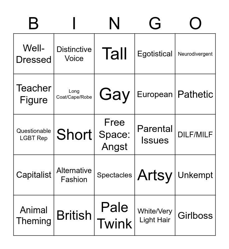 This bingo card has a free space and 24 words: Animal Theming, Alternative Fashion, Gay, White/Very Light Hair, Neurodivergent, Well-Dressed, Distinctive Voice, Tall, Parental Issues, DILF/MILF, Questionable LGBT Rep, Long Coat/Cape/Robe, Artsy, Unkempt, Teacher Figure, British, Pale Twink, Egotistical, Pathetic, Capitalist, Short, Spectacles, European and Girlboss.