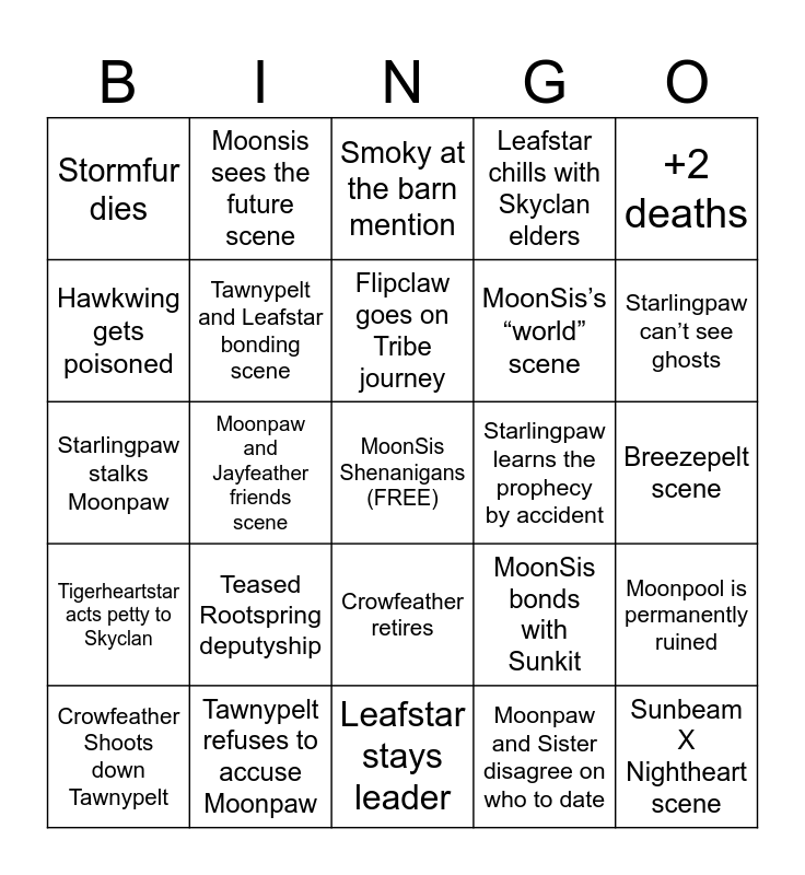 This bingo card has a free space and 24 words: Crowfeather Shoots down Tawnypelt, Teased Rootspring deputyship, Flipclaw goes on Tribe journey, Moonpaw and Sister disagree on who to date, +2 deaths, Stormfur dies, Moonsis sees the future scene, Smoky at the barn mention, Starlingpaw learns the prophecy by accident, Breezepelt scene, Starlingpaw stalks Moonpaw, Tawnypelt and Leafstar bonding scene, MoonSis bonds with Sunkit, Moonpool is permanently ruined, Hawkwing gets poisoned, Tawnypelt refuses to accuse Moonpaw, Leafstar stays leader, Leafstar chills with Skyclan elders, Starlingpaw can’t see ghosts, Tigerheartstar acts petty to Skyclan, Moonpaw and Jayfeather friends scene, Crowfeather retires, MoonSis’s “world” scene and Sunbeam X Nightheart scene.