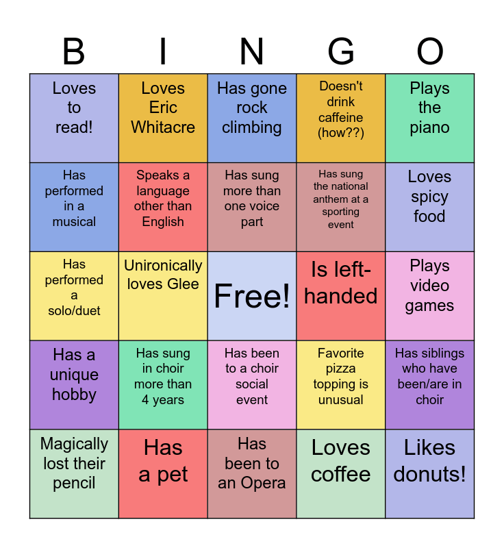 This bingo card has a free space and 24 words: Has sung in choir more than 4 years, Has a pet, Has sung more than one voice part, Magically lost their pencil, Plays the piano, Loves to read!, Has performed in a musical, Loves Eric Whitacre, Is left-handed, Has been to a choir social event, Has sung the national anthem at a sporting event, Has performed a solo/duet, Favorite pizza topping is unusual, Has siblings who have been/are in choir, Speaks a language other than English, Loves coffee, Plays video games, Has gone rock climbing, Loves spicy food, Unironically loves Glee, Likes donuts!, Has a unique hobby, Doesn't drink caffeine (how??) and Has been to an Opera.