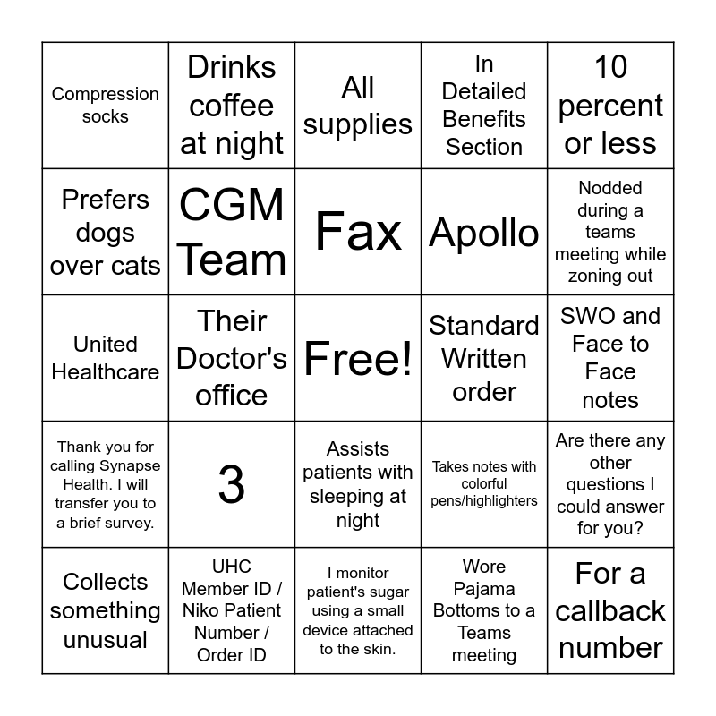 This bingo card has a free space and 41 words: Durable Medical Equipment, United Healthcare, 10 Days, CGM Team, UHC Member ID / Niko Patient Number / Order ID, Assists patients with sleeping at night, Fax, Email, 10 percent or less, Thank you for calling Synapse Health. I will transfer you to a brief survey., Their Doctor's office, In Detailed Benefits Section, For a callback number, SWO and Face to Face notes, Standard Written order, 3, 5 years, Compression socks, Back Braces, All supplies, Are there any other questions I could answer for you?, CGM supplies, I monitor patient's sugar using a small device attached to the skin., Apollo, Cosmo, Made a "To-do" list and ignored it., Wore Pajama Bottoms to a Teams meeting, Sent a GIF instead of a real response, Nodded during a teams meeting while zoning out, Ate lunch at 10:30, Loves pineapple on pizza, Drinks coffee at night, Collects something unusual, Likes spicy food, Takes notes with colorful pens/highlighters, Prefers dogs over cats, Prefers cats over dogs, Speaks more than one language, Is not a morning person, Keeps snacks at their desk and Wakes up before 6 AM.
