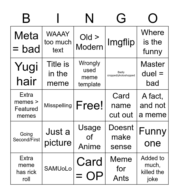 This bingo card has a free space and 32 words: Meme for Ants, Meme for Giants, Misspelling, Banlist, Going Second/First, Title is in the meme, Where is the funny, Funny one, WAAAY too much text, 2016 meme template, Wrongly used meme template, Old > Modern, Card = bad, Maxx "C", Card name cut out, Other language = funny, Extra meme has rick roll, Extra memes > Featured memes, Usage of Anime, Just a picture, Doesnt make sense, Meme template used twice, A fact, and not a meme, SAMUoLo, Added to much, killed the joke, Imgflip, Badly cropped/photoshopped, Yugi hair, Meta = bad, Card = OP, Extra meme is >2min YouTube Video and Master duel = bad.