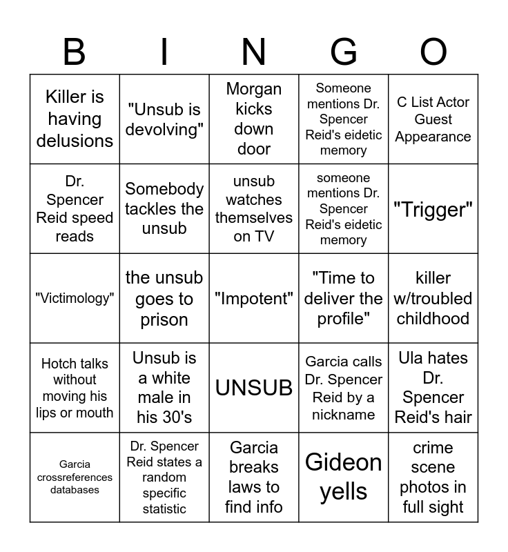 This bingo card has 45 words: Playing games on private jet, "Impotent", Dr. Spencer Reid says "actually", Garcia crossreferences databases, Morgan/Garcia flirt, Gideon yells, Morgan kicks down door, Garcia answers the phone w/something clever and/or inappropriate, C List Actor Guest Appearance, Dr. Spencer Reid states a random specific statistic, Someone mentions Dr. Spencer Reid's eidetic memory, "Time to deliver the profile", UNSUB, Unsub is a white male in his 30's, "This is highly unusual", Garcia breaks laws to find info, "Wheels up in 20" (or 30)", "Victimology", "cooling-off period", "Trigger", "Unsub is devolving", Team is called in on their day off, "Stressor", Killer is having delusions, Dr. Spencer Reid speed reads, killer w/troubled childhood, killer is having delusions, Blonde FBI boss lady shows up, Garcia calls Dr. Spencer Reid by a nickname, Hotch talks without moving his lips or mouth, Ula loves Dr. Spencer Reid's hair, Ula hates Dr. Spencer Reid's hair, unsub's M.O. uncannily reflected from childhood trauma, breaking into an empty house, the unsub dies at the end, the unsub goes to prison, "cooling-off period", "close your eyes to remember", crime scene photos in full sight, unsub watches themselves on TV, Dr. Spencer Reid speed reads, someone mentions Dr. Spencer Reid's eidetic memory, Garcia answers the phone w/something clever and/or inappropriate, Somebody tackles the unsub and "it's time to deliver the profile".