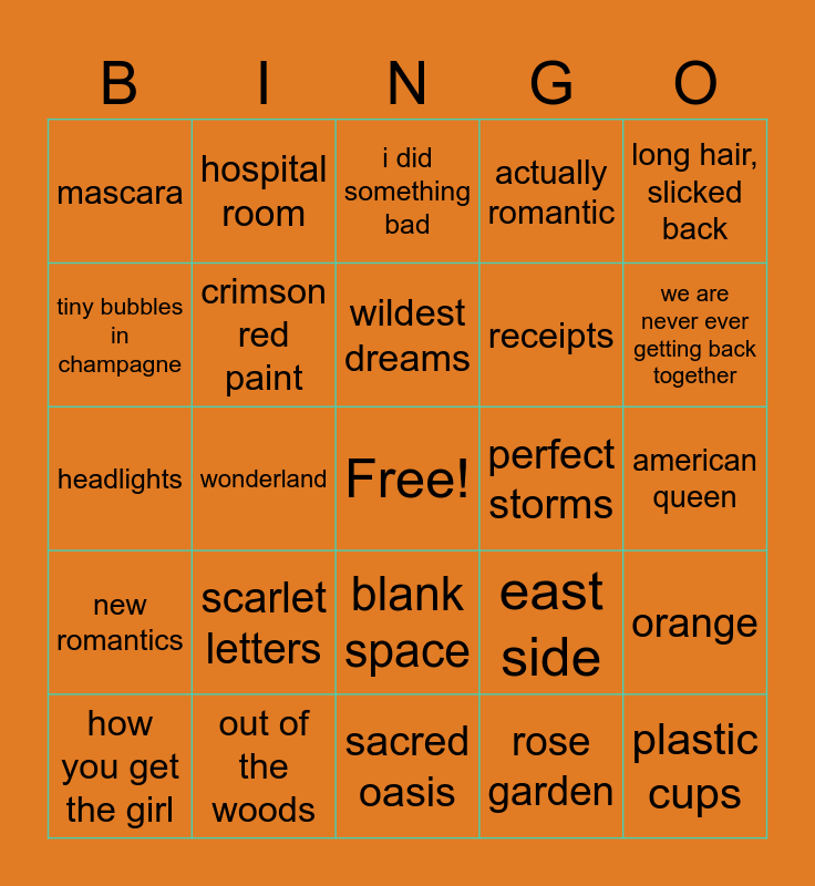 This bingo card has a free space and 119 words: the fate of ophelia, elizabeth taylor, opalite, father figure, eldest daughter, ruin the friendship, actually romantic, wi$h li$t, wood, CANCELLED!, honey, the life of a showgirl, …ready for it?, 22, all you had to do was stay, bad blood, blank space, dancing with our hands tied, end game, gorgeous, how you get the girl, i did something bad, i knew you were trouble, i wish you would, king of my heart, new romantics, out of the woods, shake it off, so it goes…, style, we are never ever getting back together, wildest dreams, wonderland, message in a bottle, phantom, robber, jailer, richard burton, hipsters, suit and tie, new money, magazine, passport, starbucks lovers, cherry lips, crystal skies, perfect storms, rose garden, invisible locket, sacred oasis, avalanche, east side, dive bar, nightstand, dark jeans, nikes, west side, poison ivy, a-team, 4th of july, hatchets, whisky on ice, sunset and vine, ocean blue eyes, narcissist, crimson red paint, playboy, witches, receipts, headlights, crooked love, american queen, motown beat, kingdom, expensive cars, range rovers, jaguars, plastic cups, scarlet letters, mascara, national anthem, record changer, polaroid, screaming color, last december, necklace, paper airplanes, twenty stiches, hospital room, monsters, his new girlfriend, magician, gold cage, illusionist, james dean, red lips, long hair, slicked back, white t-shirt, tight little skirt, indie record, nice dress, rosy cheeks, rabbit hole, cheshire cat smile, london, sweat and vanilla perfume, it’s beautiful, it’s rapturous, it’s frightening, shiny bug, baby, that’s show business, tiny bubbles in champagne, the crowd is your king, red, 1989, reputation, feathers, orange and TS12.