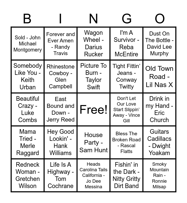 This bingo card has a free space and 99 words: He Stopped Loving Her Today - George Jones, I Love a Rainy Night - Eddie Rabbitt, People Are Crazy - Billy Currington, Wagon Wheel - Darius Rucker, That's My Kind Of Night - Luke Bryan, On The Road Again - Willie Nelson, Save a Horse - Big & Rich, Stand by Your Man - Tammy Wynette, The Gambler - Kenny Rogers, Heart Like A Truck - Lainey Wilson, Eyes On You - Chase Rice, Carrying Your Love With Me - George Strait, Goodbye Earl - The Chicks, House Party - Sam Hunt, She's No Lady - Lyle Lovett, Sold - John Michael Montgomery, Forever and Ever Amen - Randy Travis, Stronger Beer - Tim Hicks, Hey Driver - Zach Bryan, Something Like That - Tim McGraw, Should've Been A Cowboy - Toby Keith, Written in the Sand - Old Dominion, Your Man - Josh Turner, Wanted - Hunter Hayes, Honky Tonk Badonkadonk - Trace Adkins, Guitars Cadillacs - Dwight Yoakam, Picture To Burn - Taylor Swift, When the Sun Goes Down - Kracker, Jackson - June Carter Cash, You Don’t Know Me - Ray Charles, Heads Carolina Tails California - Jo Dee Messina, Fishin' in the Dark - Nitty Gritty Dirt Band, This One's for the Girls - Martina McBride, Homewrecker - Willow Avalon, East Bound and Down - Jerry Reed, Beautiful Crazy - Luke Combs, Before He Cheats - Carrie Underwood, Follow Me - Uncle Kracker, It's A Great Day To Be Alive - Travis Tritt, Hey Good Lookin' - Hank Williams, Walking In Memphis - Lonestar, Old Town Road - Lil Nas X, I'm A Survivor - Reba McEntire, Life Is A Highway - Tom Cochrane, Boys 'Round Here - Blake Shelton, Broken Halos - Chris Stapleton, Pour Me A Drink - Post Malone, Little Bitty - Alan Jackson, Friends in Low Places - Garth Brooks, A Bar Song - Shaboozey, Beat of the Music - Brett Eldredge, Smoky Mountain Rain - Ronnie Milsap, Bless The Broken Road - Rascal Flatts, Look What God Gave Her - Thomas Rhett, Til You Can't - Cody Johnson, Take Me Home Country Roads - John Denver, Who Says You Can't Go - Home Bon Jovi, Chicken Fried - Zac Brown Band, Crazy - Patsy Cline, Any Man Of Mine - Shania Twain, Got Your Name On It - Jade Eagleson, Boot Scootin' Boogie - Brooks & Dunn, Highwayman - The Highwaymen, TEXAS HOLD 'EM - Beyoncé, Delta Dawn - Tanya Tucker, Dust On The Bottle - David Lee Murphy, This Kiss - Faith Hill, Girl Crush - Little Big Town, The Devil Went Down to Georgia - The Charlie Daniels Band, Mama Tried - Merle Raggard, Last Night - Morgan Wallen, Tight Fittin’ Jeans - Conway Twitty, Somebody Like You - Keith Urban, Stuck Like Glue - Sugarland, This Is My Dirt - Justin Moore, Fancy Like - Walker Hayes, Rhinestone Cowboy - Glen Campbell, When You Say Nothing at All - Keith Whitley, Sweet Home Alabama - Lynyrd Skynyrd, Sun Darts - Letterkenny, Don't Let Our Love Start Slippin’ Away - Vince Gill, Achy Breaky Heart - Billy Ray Cyrus, Meant to Be - Bebe Rexha, She's In Love With The Boy - Trisha Yearwood, Blue - LeAnn Rimes, Ring of Fire - Johnny Cash, I Don’t Need Your Rocking Chair - Mark Chesnutt, What Was I Thinkin' - Dierks Bentley, Drink in my Hand - Eric Church, Redneck Woman - Gretchen Wilson, Coal Miners Daughter - Loretta Lynn, Jolene - Dolly Parton, Big Iron - Marty Robbins, Make the World Go Away - Eddy Arnold, You Make It Easy - Jason Aldean, How Country Feels - Randy Houser, Mud on the Tires - Brad Paisley, I'm in a Hurry - Alabama and 10 000 Hours - Dan + Shay.