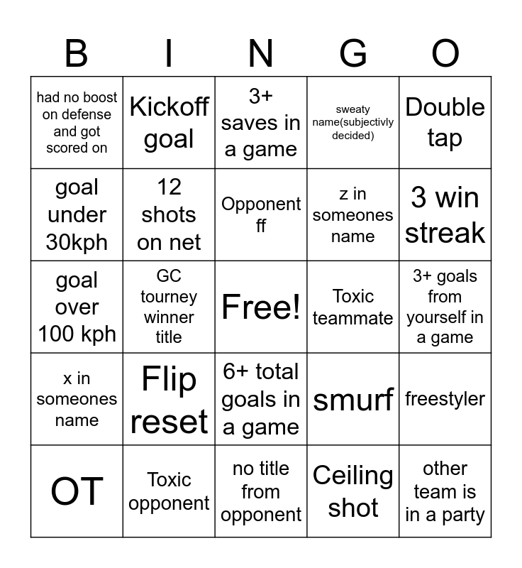 This bingo card has a free space and 24 words: Flip reset, Toxic opponent, Opponent ff, OT, Double tap, had no boost on defense and got scored on, goal under 30kph, Kickoff goal, Toxic teammate, 6+ total goals in a game, z in someones name, goal over 100 kph, smurf, freestyler, 12 shots on net, Ceiling shot, 3+ goals from yourself in a game, 3+ saves in a game, 3 win streak, GC tourney winner title, other team is in a party, x in someones name, sweaty name(subjectivly decided) and no title from opponent.
