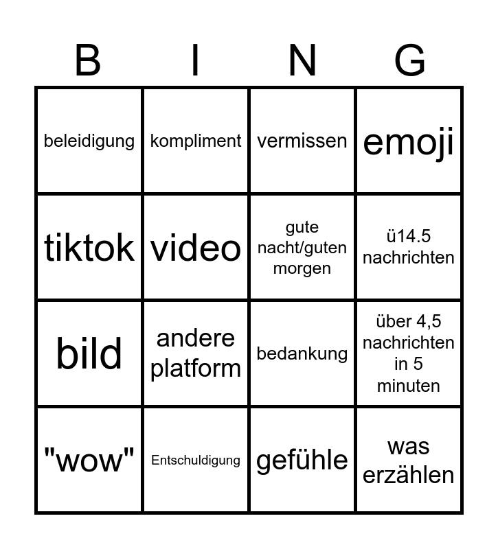 This bingo card has 16 words: Entschuldigung, über 4,5 nachrichten in 5 minuten, vermissen, beleidigung, bild, kompliment, bedankung, gefühle, tiktok, video, "wow", emoji, andere platform, ü14.5 nachrichten, gute nacht/guten morgen and was erzählen.