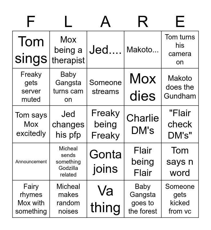 This bingo card has a free space and 24 words: Micheal sends something Godzilla related, Micheal makes random noises, Someone streams, Fairy rhymes Mox with something, Tom turns his camera on, Tom sings, Freaky gets server muted, Mox being a therapist, Charlie DM's, Gonta joins, Mox dies, Tom says Mox excitedly, Flair being Flair, Tom says n word, Baby Gangsta turns cam on, Baby Gangsta goes to the forest, "Flair check DM's", Jed...., Makoto does the Gundham, Jed changes his pfp, Someone gets kicked from vc, Announcement, Makoto... and Va thing.