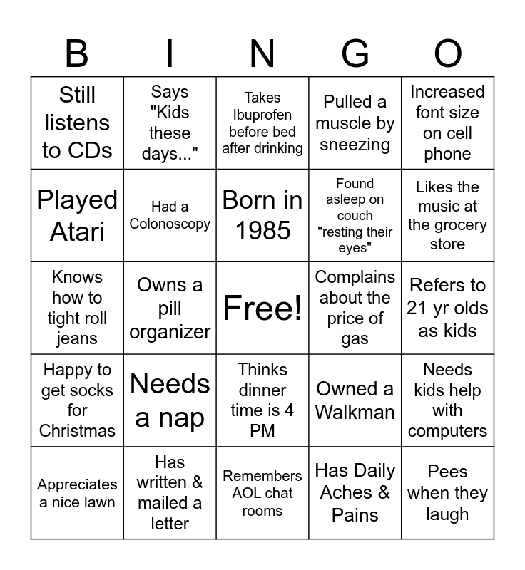 This bingo card has a free space and 24 words: Needs a nap, Has written & mailed a letter, Born in 1985, Appreciates a nice lawn, Increased font size on cell phone, Still listens to CDs, Played Atari, Says "Kids these days...", Complains about the price of gas, Thinks dinner time is 4 PM, Found asleep on couch "resting their eyes", Knows how to tight roll jeans, Owned a Walkman, Needs kids help with computers, Had a Colonoscopy, Has Daily Aches & Pains, Refers to 21 yr olds as kids, Takes Ibuprofen before bed after drinking, Likes the music at the grocery store, Owns a pill organizer, Pees when they laugh, Happy to get socks for Christmas, Pulled a muscle by sneezing and Remembers AOL chat rooms.