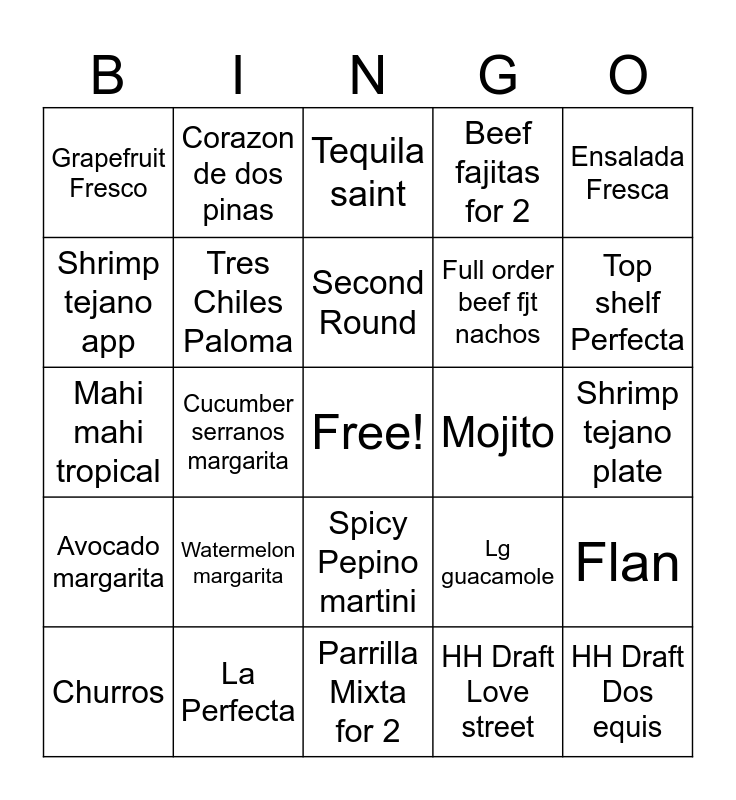This bingo card has a free space and 30 words: La Perfecta, Flaca, Cucumber serranos margarita, Pina Jalapeno, Grapefruit Fresco, Tequila saint, Tres Chiles Paloma, Spicy Pepino martini, Mojito, Parrilla Mixta for 2, Shrimp tejano plate, HH Draft Dos equis, HH Draft Love street, HH wine, Top shelf Perfecta, Lg queso Perfecto, Lg guacamole, Avocado margarita, Watermelon margarita, Ensalada Fresca, Mahi mahi tropical, Fish tacos, Corazon de dos pinas, Full order beef fjt nachos, Shrimp tejano app, Beef fajitas for 2, Flan, Churros, Second Round and Shot.