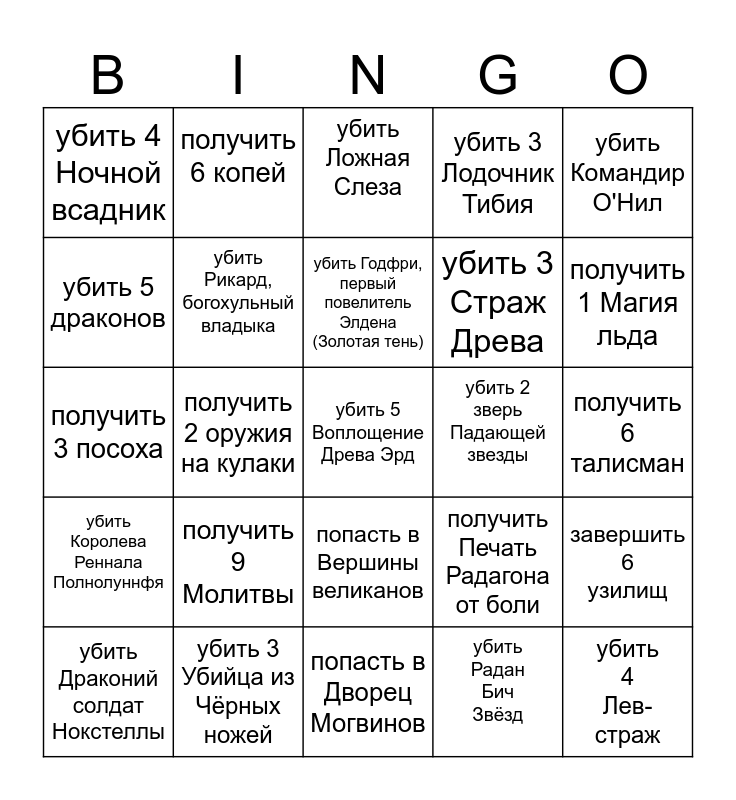 This bingo card has 60 words: убить мог повелитель крови, убить 3 Убийца из Чёрных ножей, убить Годрик Сторукий, убить Королева Реннала Полнолуннфя, убить Радан Бич Звёзд, убить Морготт, король знамений, убить Рикард, богохульный владыка, убить Дух величавого предка, убить 3 Страж Древа, убить 2 Охотник за колокольными сферами, убить 3 Лодочник Тибия, убить 4 Цербер кладбища Древа Эрд, убить 5 драконов, убить 4 древесный дух, убить 3 Птица смерти, убить 4 Ночной всадник, убить 5 Воплощение Древа Эрд, убить Командир О'Нил, убить 7 Кристалиец, убить Годфри, первый повелитель Элдена (Золотая тень), убить 2 зверь Падающей звезды, убить Ложная Слеза, убить Драконий солдат Нокстеллы, завершить 6 узилищ, убить 6 боссов на лошадях, убить Червемордый, убить Лоретта, королевский рыцарь, получить 2 Гравитационная магия, получить 1 Магия льда, получить Комета Азура, получить 1 Магия шипов, получить 2 легендарных оружия, получить 6 щитов, получить 3 катаны, получить 6 копей, получить 2 косы, получить 2 хлыста, получить 2 оружия на кулаки, получить 3 факела, получить 3 посоха, получить 3 Молитвы Гурранка, жреца-зверя, получить 9 Молитвы, получить 6 талисман, получить 4 корня смерти, получить Печать Радагона от боли, убить драконий страж древа, попасть в сталицу лэиндэила, использовать Великий подъёмник Дектуса, попасть в Вулкан Гельмир, попасть в Вершины великанов, попасть в Дворец Могвинов, убить Родич Чёрного Клинка, убить Аристократ божественной кожи, убить Апостол божественной кожи, получить 7 прахов, получить 18 пеплов войны, убить 1 раз каждые 6 видов скарабеев, ваншотнуть 1 босса, убить 4 Лев-страж and прокачать любое оружие до +7.