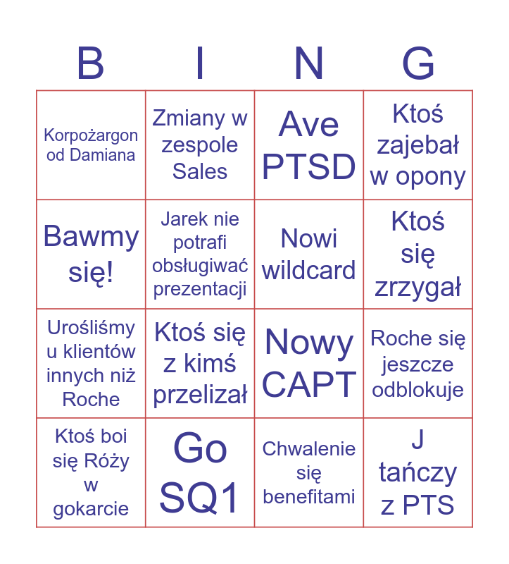 This bingo card has 16 words: Go SQ1, Roche się jeszcze odblokuje, Ave PTSD, Korpożargon od Damiana, Urośliśmy u klientów innych niż Roche, Zmiany w zespole Sales, Nowy CAPT, Chwalenie się benefitami, Bawmy się!, Jarek nie potrafi obsługiwać prezentacji, Ktoś boi się Róży w gokarcie, Ktoś zajebał w opony, Ktoś się z kimś przelizał, Ktoś się zrzygał, Nowi wildcard and J tańczy z PTS.