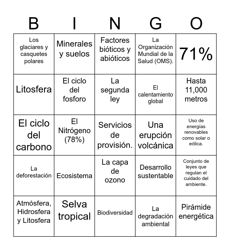 This bingo card has a free space and 24 words: Ecosistema, Selva tropical, La segunda ley, Atmósfera, Hidrosfera y Litosfera, 71%, Los glaciares y casquetes polares, Litosfera, Minerales y suelos, Una erupción volcánica, La capa de ozono, El calentamiento global, El ciclo del carbono, Desarrollo sustentable, Conjunto de leyes que regulan el cuidado del ambiente., El ciclo del fosforo, La degradación ambiental, Uso de energías renovables como solar o eólica., Factores bióticos y abióticos, Hasta 11,000 metros, El Nitrógeno (78%), Pirámide energética, La deforestación, La Organización Mundial de la Salud (OMS). and Biodiversidad.