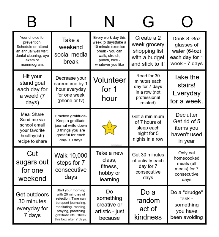 This bingo card has a free space and 24 words: Walk 10,000 steps for 7 consecutive days, Start your morning with 20 minutes of refection. Time can be spent journaling, meditating, reading, praying, practicing gratitude etc. Check this box after 7 days., Volunteer for 1 hour, Get outdoors 30 minutes everyday for 7 days, Drink 8 -8oz glasses of water (64oz) each day for 1 week - 7 days, Your choice for prevention! Schedule or attend an annual well visit, dental cleaning, eye exam or mammogram., Hit your stand goal each day for a week! (7 days), Take a weekend social media break, Get a minimum of 7 hours of sleep each night for 5 nights in a row, Take a new class, fitness, hobby or learning, Read for 30 minutes each day for 7 days in a row (not professional related), Meal Share Send me via school email your favorite healthy(ish) recipe to share, Get 30 minutes of activity each day for 7 consecutive days, Only eat homecooked meals (all meals) for 7 consecutive days, Decrease your screentime by 1 hour everyday for one week (phone or tv), Do a random act of kindness, Declutter Get rid of 5 items you haven't used in year, Every work day this week (5 days)take a 10 minute exercise break - you can walk, stretch, punch, bike - whatever you like, Take the stairs! Everyday for a week., Practice gratitude- Keep a gratitude journal write down 3 things you are grateful for each day- 10 days, Do a "drudge" task - something you have been avoiding, Cut sugars out for one weekend, Create a 2 week grocery shopping list with a budget and stick to it! and Do something creative or artistic - just because.
