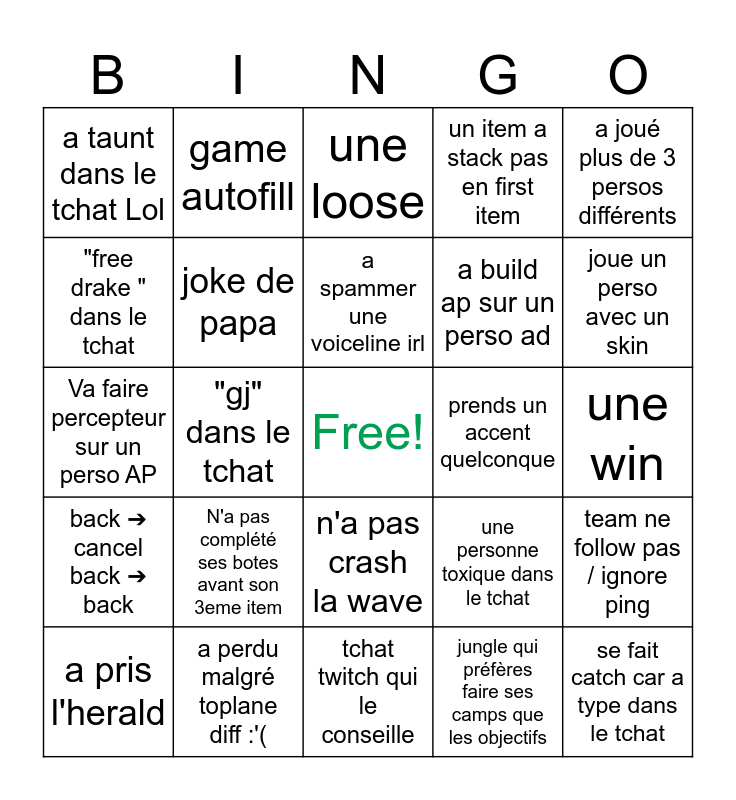 This bingo card has a free space and 24 words: N'a pas complété ses botes avant son 3eme item, a perdu malgré toplane diff :'(, a spammer une voiceline irl, a pris l'herald, a joué plus de 3 persos différents, a taunt dans le tchat Lol, "free drake " dans le tchat, game autofill, prends un accent quelconque, n'a pas crash la wave, a build ap sur un perso ad, Va faire percepteur sur un perso AP, une personne toxique dans le tchat, team ne follow pas / ignore ping, joke de papa, jungle qui préfères faire ses camps que les objectifs, une win, une loose, joue un perso avec un skin, "gj" dans le tchat, se fait catch car a type dans le tchat, back ➔ cancel back ➔ back, un item a stack pas en first item and tchat twitch qui le conseille.