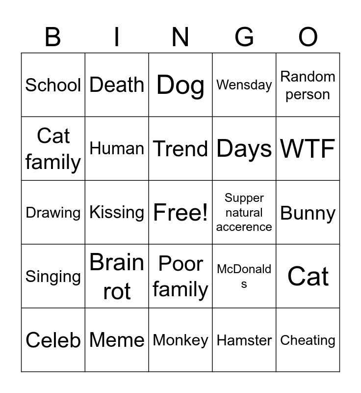 This bingo card has a free space and 24 words: Brain rot, Meme, Trend, Celeb, Random person, School, Cat family, Death, Supper natural accerence, Poor family, Days, Drawing, McDonald s, Cat, Human, Hamster, Bunny, Dog, WTF, Kissing, Cheating, Singing, Wensday and Monkey.