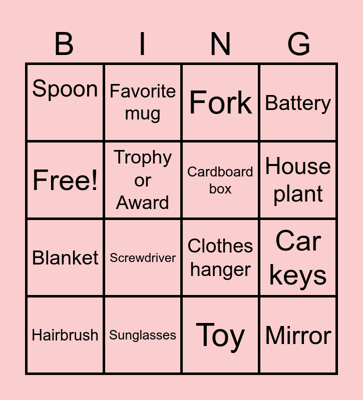 This bingo card has 16 words: Sunglasses, Car keys, Fork, Spoon, Blanket, Favorite mug, Clothes hanger, Toy, Free!, Trophy or Award, Hairbrush, Battery, Screwdriver, House plant, Cardboard box and Mirror.