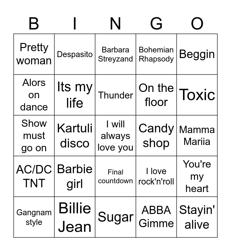 This bingo card has 25 words: AC/DC TNT, Billie Jean, I will always love you, ABBA Gimme, Beggin, Pretty woman, Despasito, Barbara Streyzand, Candy shop, You're my heart, Alors on dance, Its my life, Sugar, I love rock'n'roll, Toxic, Gangnam style, Kartuli disco, Thunder, On the floor, Mamma Mariia, Show must go on, Barbie girl, Final countdown, Bohemian Rhapsody and Stayin' alive.