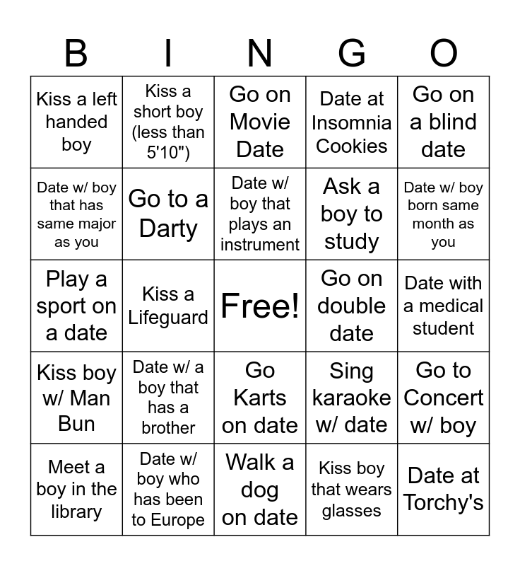 This bingo card has a free space and 34 words: Starbucks Date, Kiss boy that wears glasses, Two-step w/ boy, 2 Dates, 2 Different Boys, Same Day, Kiss boy w/ Man Bun, Go to a Darty, Go on a blind date, Meet a boy in the library, Kiss a short boy (less than 5'10"), Kiss a tall boy (over 6'1"), Date w/ boy that plays an instrument, Go on Movie Date, Date w/ boy getting graduate degree, Go to Fraternity Formal, Go on double date, Date w/ boy born same month as you, Date w/ boy who has been to Europe, Play a sport on a date, Date w/ a boy that has a brother, Sing karaoke w/ date, Go Karts on date, Date w/ boy 2 years older, Kiss a left handed boy, Date with a medical student, Walk a dog on date, Date at Torchy's, Date at Insomnia Cookies, Kiss a boy in Louie's Piano Bar, Ask a boy to study, Date w/ boy that has same major as you, Date w/ boy that drives a Camero, Kiss a Lifeguard, Go to Concert w/ boy and Pool party w/ boys.